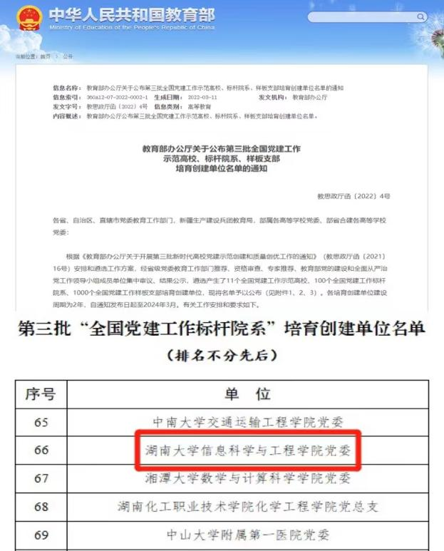 在教育部公布的“第三批全国党建工作示范高校、标杆院系、样板支部”培育创建单位名单中,tapplay信息科学与工程学院党委入选“全国党建工作标杆院系”。