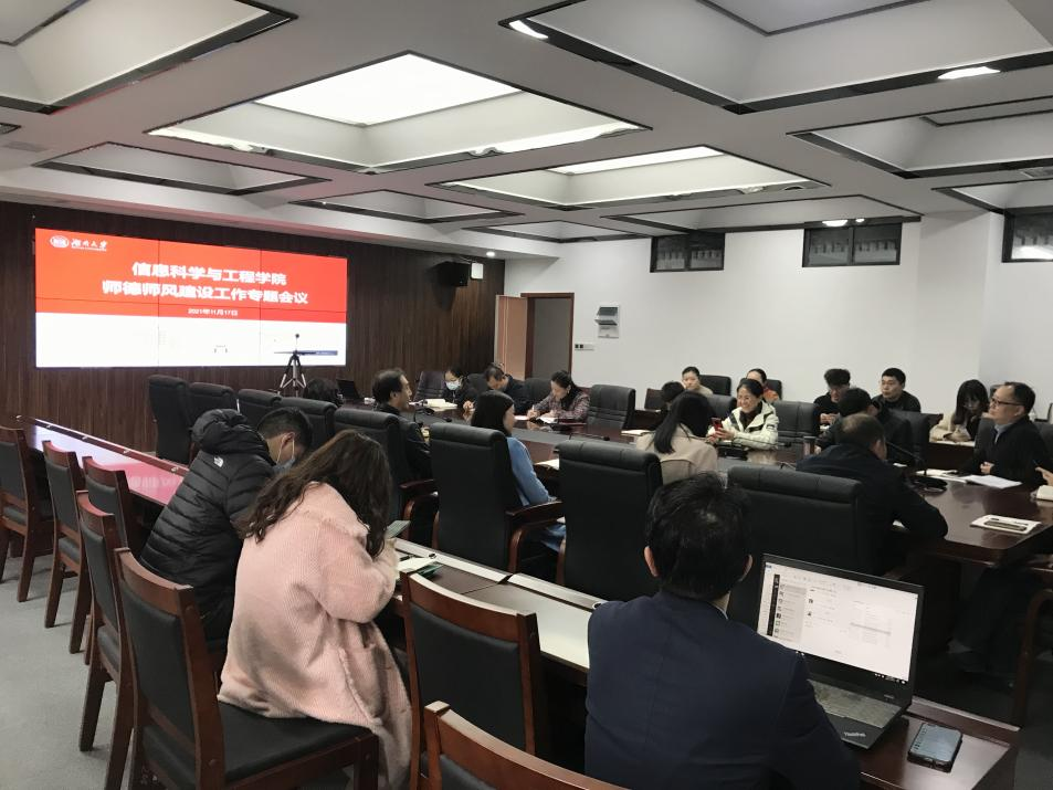实施“信念铸魂”工程,强化师德师风建设。思想明德,不忘初心强师风;课程育德,搭建平台促师风;典型树德,引领示范优师风;规则立德,四位一体正师风。学院搭建“青蓝互助”平台、教学研讨平台、教材建设平台等,在教育教学中提升师德素养,营造良好师风浓郁氛围。学院师德师风建设成效显著,汇聚了一批活跃在学术前沿的德才兼备的领军人物、青年人才和创新团队,学院教师们在教书育人、科研育人、实践育人等方面躬身实践,涌现出“宝钢优秀教师”李肯立、“湖南省高校教学奉献奖”徐成、“我心目中最敬爱的老师”肖雄仁和边耐政、“师德标兵”李智勇、“B站老男孩”杨圣洪、“湖南省三八红旗手”及“湖南省城镇妇女巾帼建功标兵”赵欢等一批先进师德典型,不断开创师德师风建设新局面。