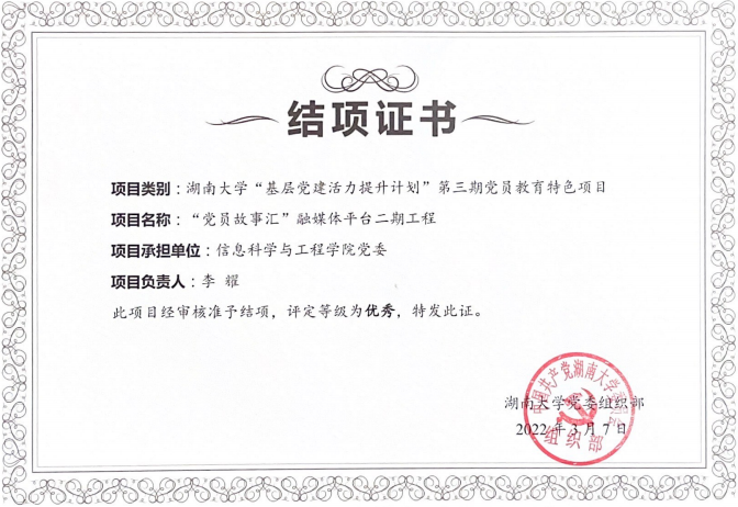 建强“三队伍”,构建协同机制,促全员育人。抓好专兼职辅导员队伍建设,配齐配强专职辅导员,遴选高年级研究生担任兼职辅导员。抓好导师队伍建设,推进导师进班级、进宿舍、进支部、进社团、进网络的“五进”工作。抓好党员学生干部队伍建设,建立以学生党员队伍为主干,共青团干部、学生会干部队伍为两翼的学生管理格局,发挥学生的“三自”作用。李肯立团队获评“湖南省优秀研究生导师团队”,谢鲲获评“湖南省优秀研究生导师”,彭嘉芬、荣辉桂获评“全国创新创业优秀指导老师”,罗娟入选首届教育部-华为“智能基座”优秀教师奖励计划,骆嘉伟等3人入选高校计算机专业优秀教师奖励计划,徐成获国家级教学成果二等奖,赵欢主讲课程获评国家级一流课程、牵头的教研室入选教育部首批虚拟教研室建设试点项目、带领的教学团队获省高校优秀基层教学组织及省教学成果一等奖,杨圣洪获“学习强国”本科教学优秀教师典型报道,徐旸等4位教师获评优秀班主任;辅导员李佳俊获全国辅导员职业能力大赛复赛二等奖,张雅静获评“宣传思想先进个人”,宋任刚获评“湖南省创业就业工作先进个人”;“心所信 行致远”毕业教育获评2021年度学生思政教育优秀作品。