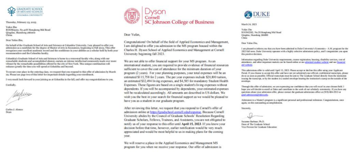 星光不负赶路人,朱昱帆的外语考试都取得了比较理想的成绩,目前她已经收到了哥伦比亚大学、康奈尔大学、杜克大学、乔治城大学、南加州大学和威斯康星大学麦迪逊分校等多所海外名校的offer。