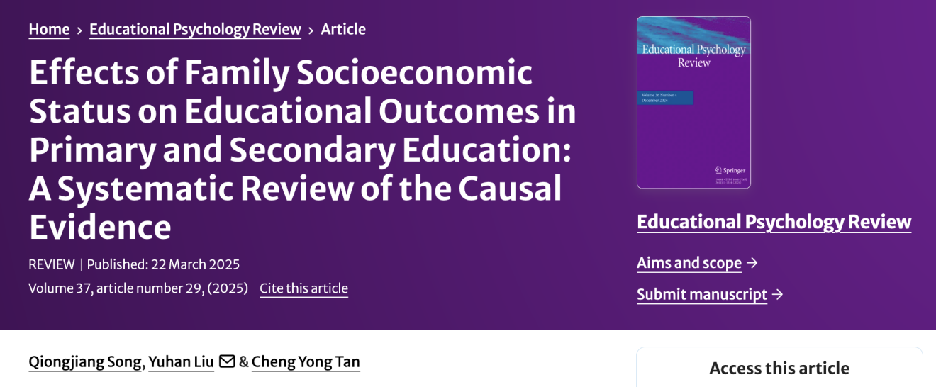 近日,教科院宋琼将老师与香港大学教育学院研究团队在教育平等政策研究领域取得进展。研究成果以《Effects of Family Socioeconomic Status on Educational Outcomes in Primary and Secondary Education: A Systematic Review of the Causal Evidence》为题,发表于教育心理学领域国际顶级期刊《Educational Psychology Review》。