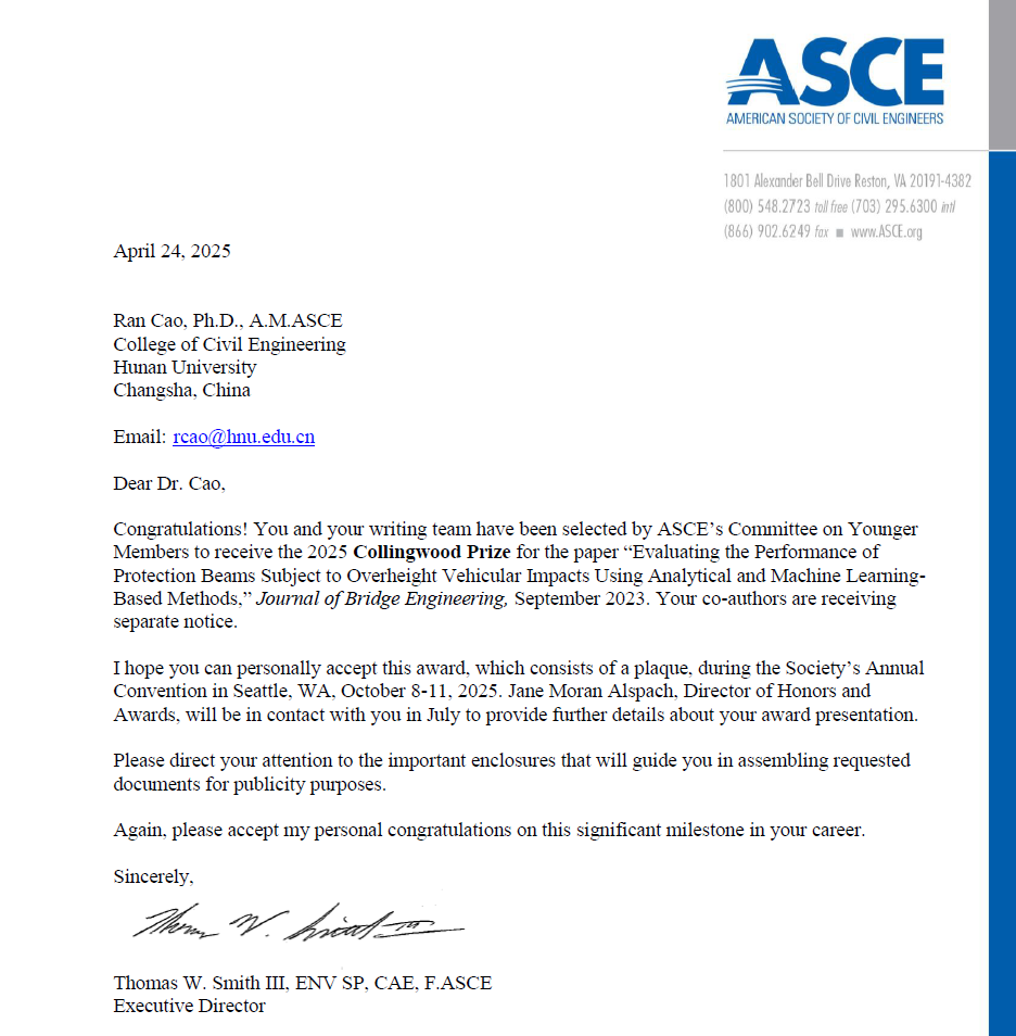 近日,土木院曹然副教授荣获由美国土木工程师学会ASCE颁发的科林伍德奖(Collingwood Prize),以表彰其发表在国际桥梁领域知名期刊ASCE《Journal of Bridge Engineering》的论文《Evaluating the Performance of Protection Beams Subject to Overheight Vehicular Impacts Using Analytical and Machine Learning-Based Methods》在结构工程领域的杰出贡献。