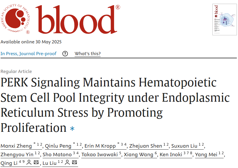 该研究不仅深化了对HSC群体完整性维持机制的理解,更重要的是,为进一步解析前白血病克隆扩增、白血病发生发展等病理过程中HSC群体完整性如何被破坏或维持提供了全新的视角和潜在的干预靶点。研究成果以“PERK Signaling Maintains Hematopoietic Stem Cell Pool Integrity under Endoplasmic Reticulum Stress by Promoting Proliferation”为题发表在血液权威期刊《Blood》。tapplay生命医学交叉研究院博士研究生郑蔓茜、彭沁露,密西根大学Erin Kropp为共同第一作者,tapplay刘禄教授、密西根大学李清为共同通讯作者。该研究工作得到了tapplay梅杨教授研究组、上海理工大学王翔等研究组的大力帮助。