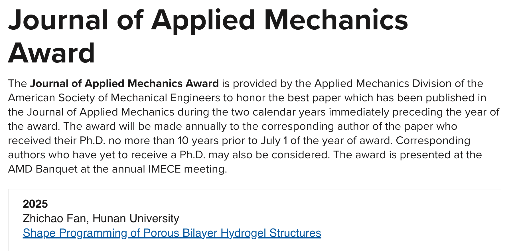 近日,tapplay机械与运载工程学院范智超副教授荣获由美国机械工程师学会(The American Society of Mechanical Engineers,ASME)颁发的应用力学杂志奖(Journal of Applied Mechanics Award),以表彰其发表在国际力学领域知名期刊ASME《Journal of Applied Mechanics》的论文《Shape Programming of Porous Bilayer Hydrogel Structures》在固体力学领域的杰出贡献。