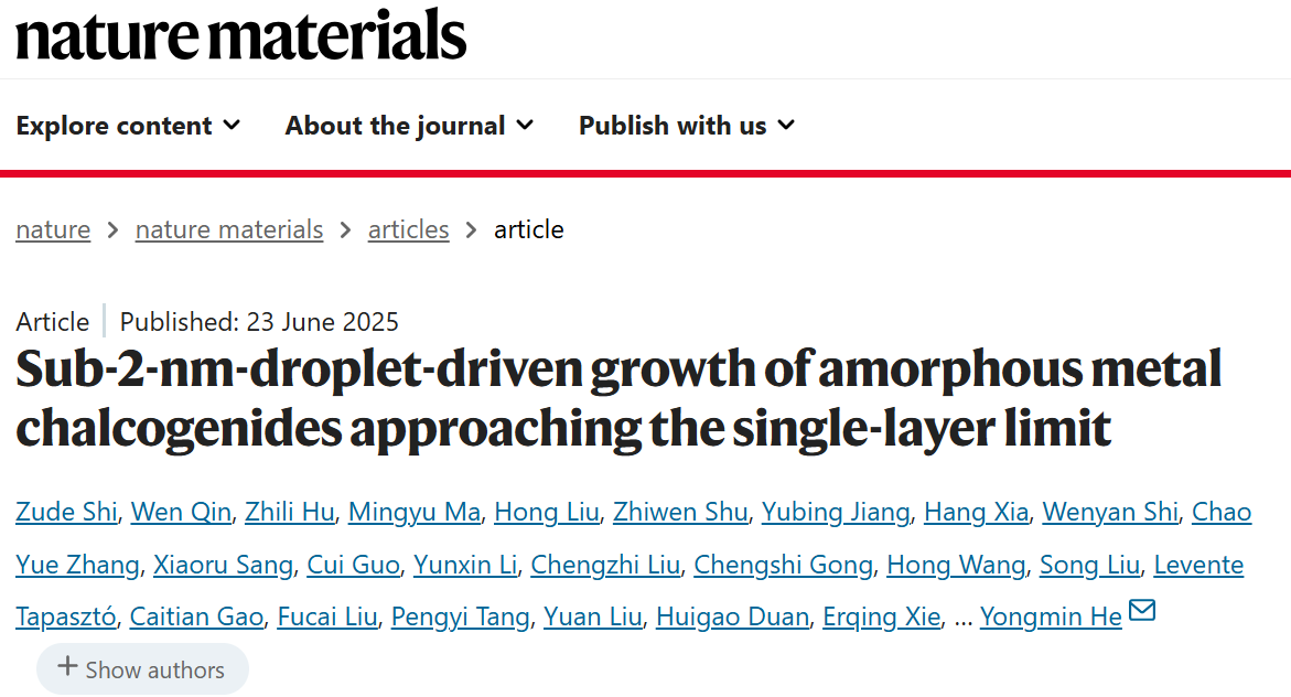 研究成果以“Sub-2-nm-droplet-driven growth of amorphous metal chalcogenides approaching the single-layer limit”为题发表在《Nature Materials》上。tapplay为论文第一单位,tapplay何勇民教授、南京航空航天大学张助华教授和新加坡南洋理工大学刘政教授为共同通讯作者,第一作者为tapplay化学化工学院博士研究生石祖德、南京航空航天大学博士研究生秦文和胡知力副教授。