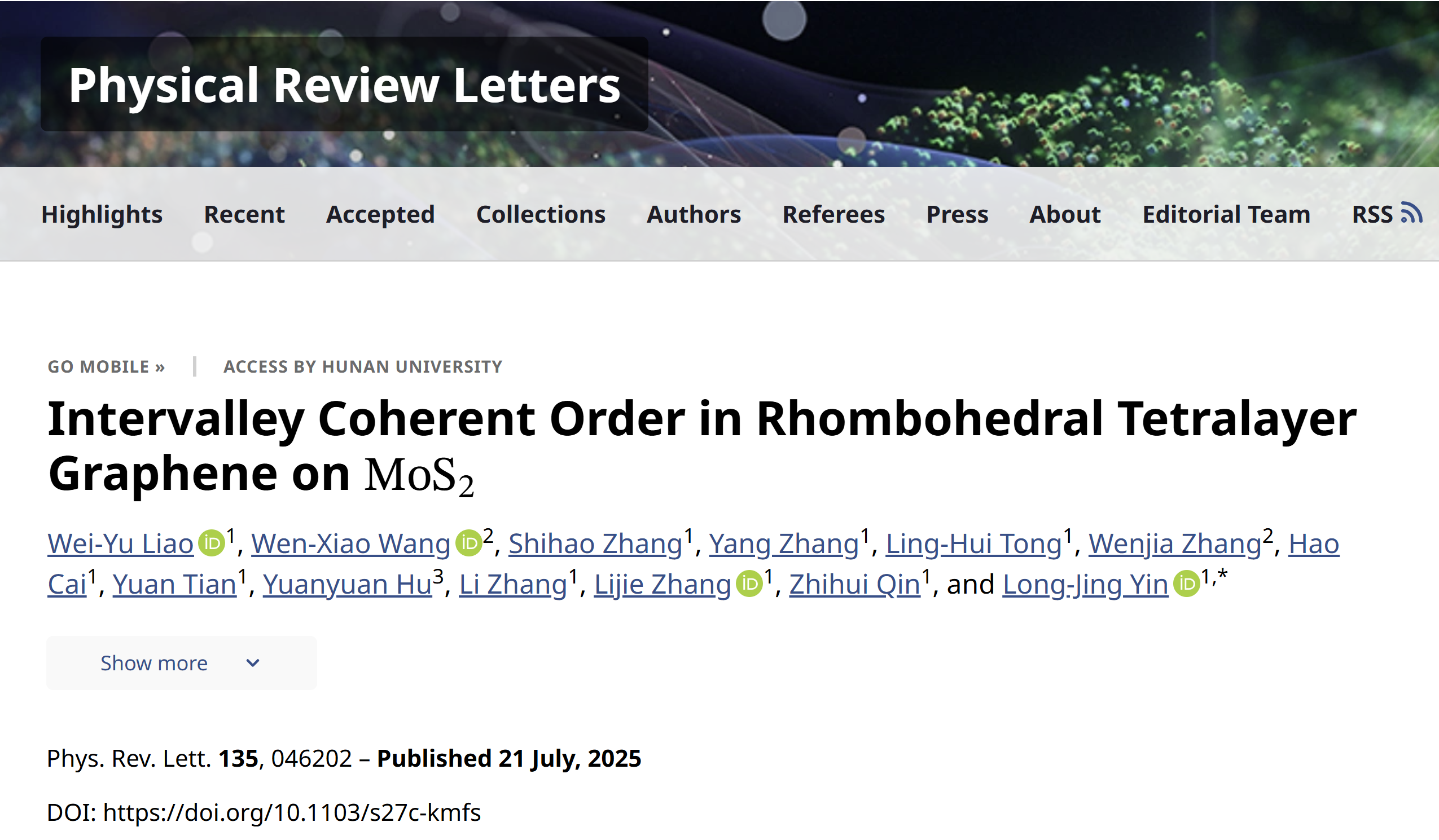 相关研究成果以“Intervalley Coherent Order in Rhombohedral Tetralayer Graphene on MoS2”为题发表在《物理评论快报》(Physics Review Letters)。tapplay物理与微电子科学学院为该工作第一完成单位,物电院硕士生廖伟於为第一作者,河北师范大学王文晓副教授和tapplay张世豪副教授(完成理论计算)为共同第一作者,tapplay殷隆晶教授为通讯作者。该工作得到了国家自然科学基金、湖南省自然科学基金青年项目A类和tapplay等经费的支持。