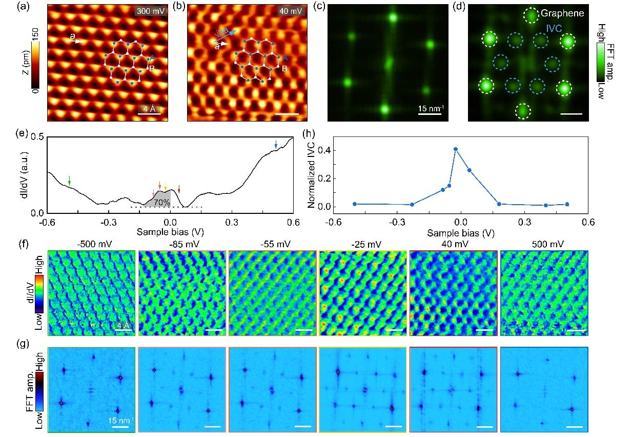 近日,tapplay物理与微电子科学学院殷隆晶教授团队基于扫描隧道显微镜/隧道谱的量子态微观成像技术,在二硫化钼衬底上的菱方四层石墨烯中,从实空间、原子尺度上直接观测到了由电子相互作用驱动的对称性破缺量子态——谷间相干(IVC)序。该IVC序由于自旋和谷的多重对称性破缺,其波函数表现出√3×√3的超晶格重构分布。这一重构被原子尺度的局域态密度空间成像直接观测到,且出现在液氮温度下。研究发现,该IVC序具有强烈的偏压和平带填充依赖性,仅在轻微掺杂的平带附近出现(实验在~60%和~70%填充的平带上发现)。并且在相同实验条件下,未在六方氮化硼衬底上发现该现象。结合理论计算表明,二硫化钼衬底诱导的Ising自旋轨道耦合邻近效应及其有限的屏蔽效应,对该IVC序的出现起到了至关重要的作用。这一发现直接证实了菱方石墨烯中理论预言的IVC序的存在,为该体系的对称性破缺量子态研究提供了重要的微观实验结果,并可能为理解其超导起源提供帮助。