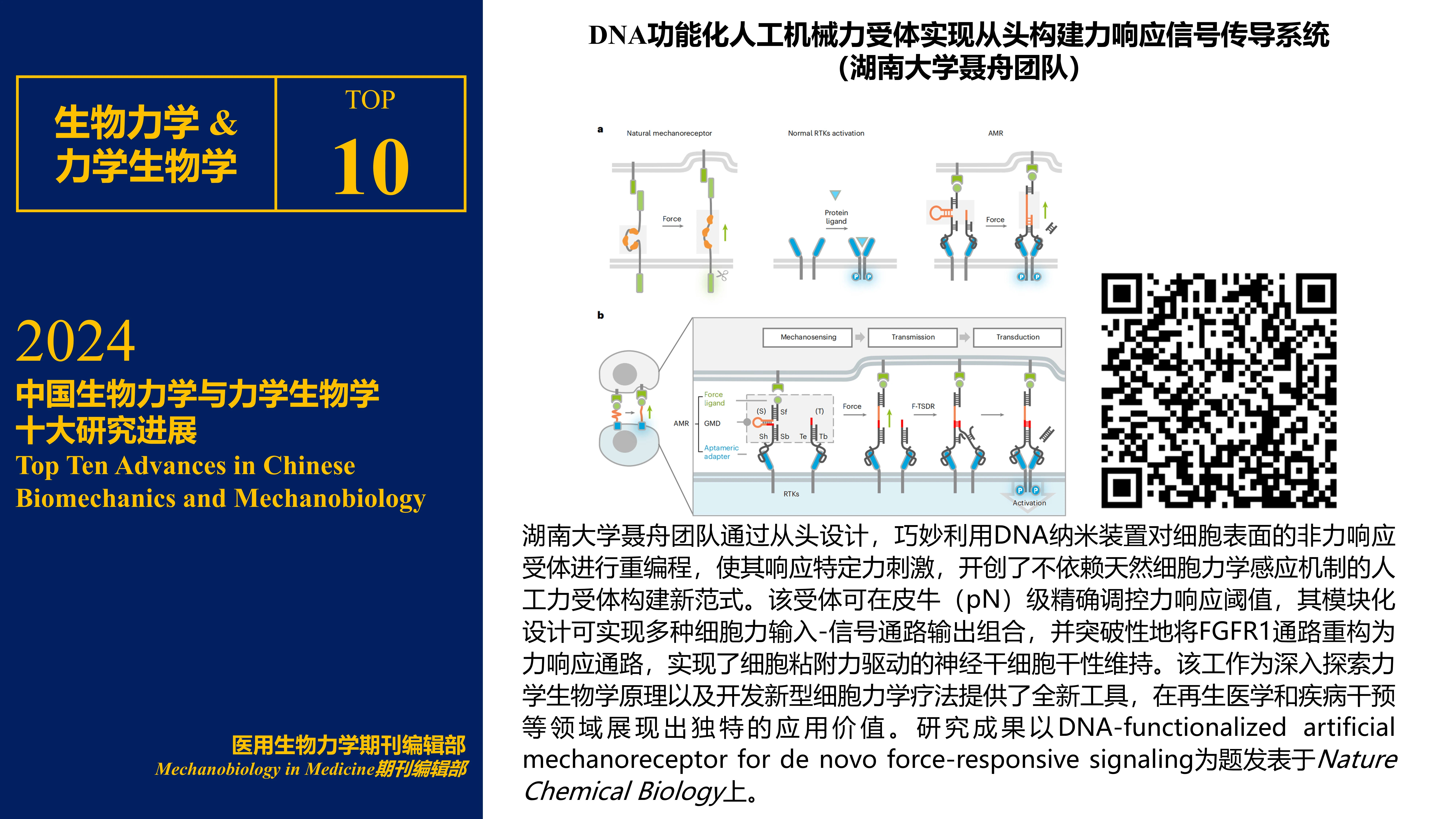 近日,化学化工学院聂舟教授团队发表于国际期刊《Nature Chemical Biology》的研究成果“DNA-functionalized Artificial Mechanoreceptor for de novo Force-responsive Signalling”入选“2024年度中国生物力学与力学生物学领域十大进展”,评选结果正式公布并刊登在《医用生物力学》杂志。