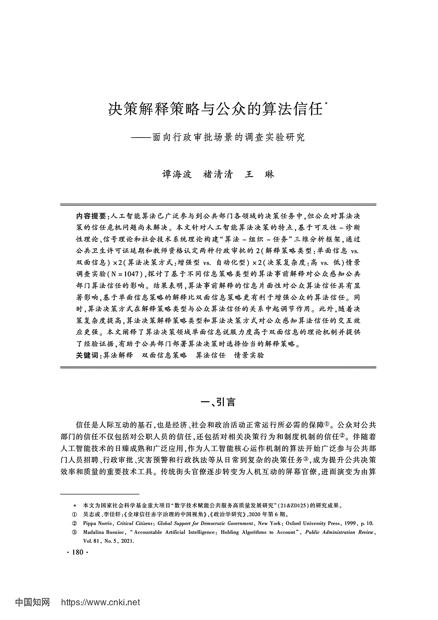 近日,公共管理学院谭海波教授在算法决策领域取得新进展。研究成果以《决策解释策略与公众的算法信任——面向行政审批场景的调查实验研究》在权威期刊《政治学研究》2025年第3期发表。