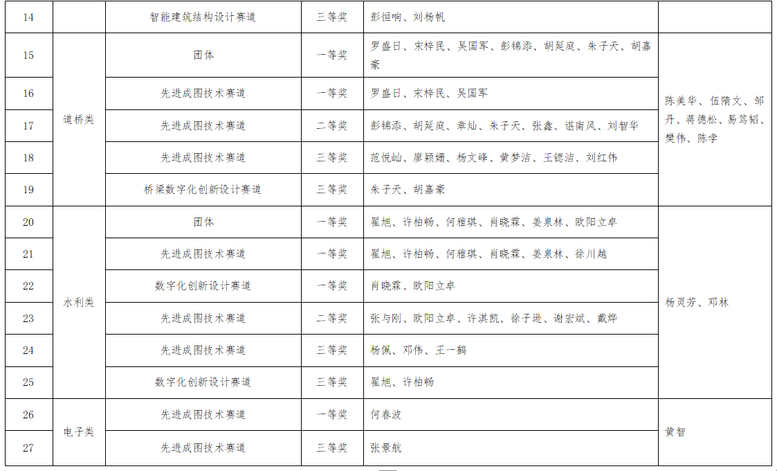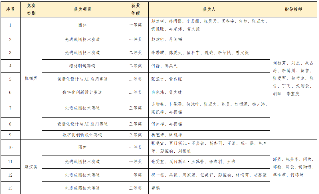 本次比赛由机械与运载工程学院、土木工程学院、建筑与规划学院、现代工程训练中心20余名教师团队指导学生队伍,在机械类、建筑类、道桥类、水利类和电子类5个专业类别的竞赛中获佳绩。