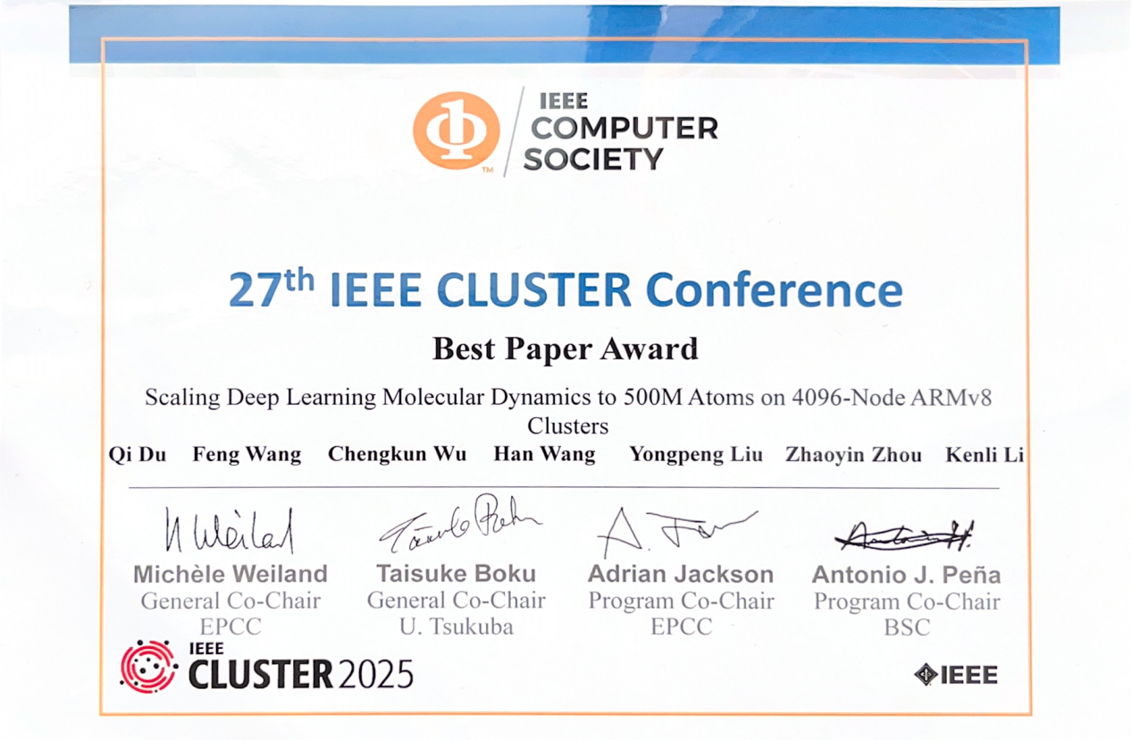 9月2日至5日在英国爱丁堡召开的第27届IEEE国际集群计算会议(IEEE International Conference on Cluster Computing,IEEE CLUSTER)上,团队成员以“Scaling Deep Learning Molecular Dynamics to 500M Atoms on 4096-Node ARMv8 Clusters”为题做了大会报告,论文荣获了大会唯一的最佳论文奖(Best Paper Award)。IEEE CLUSTER是国际高性能计算(High Performance Computing, HPC)领域的旗舰会议之一。