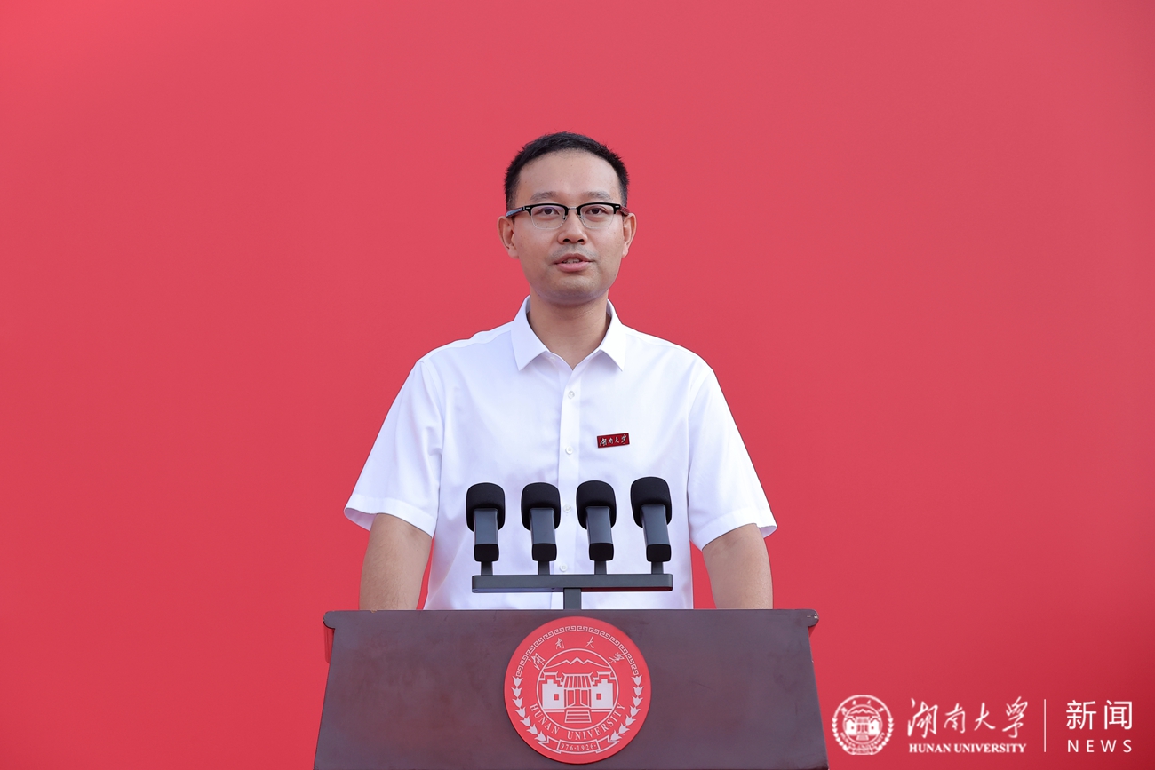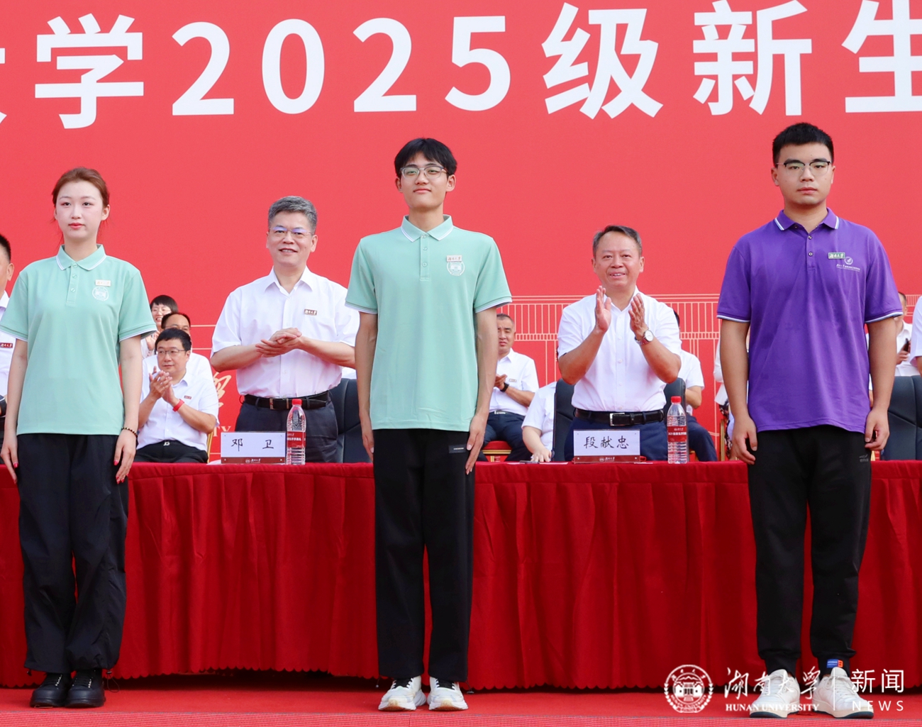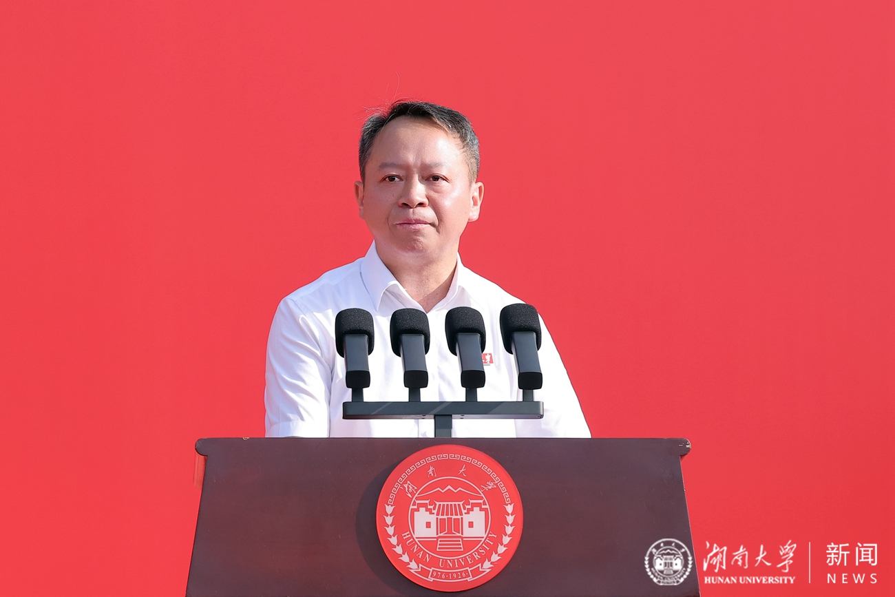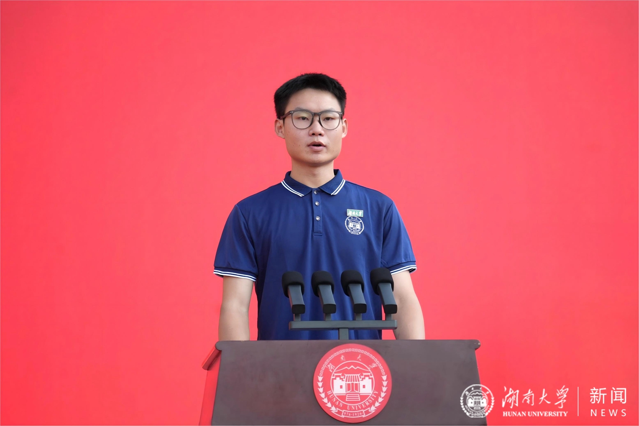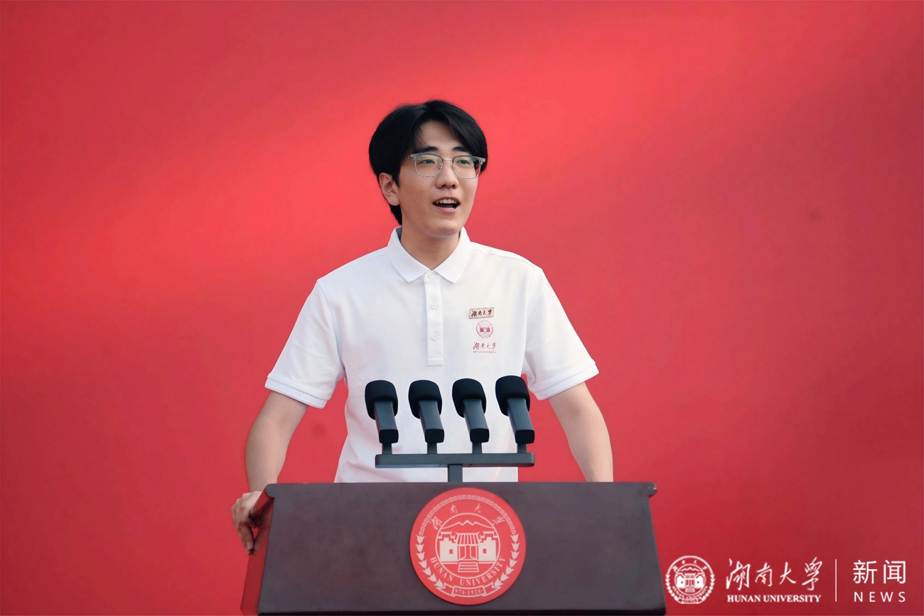 电气与信息工程学院2025级硕士研究生杨宇敞作为研究生新生代表发言。他表示,作为新时代研究生,当胸怀报国之志,投身祖国需要的战场;当以实干践真知,将论文写在祖国的大地;当以恒心攀高峰,坚守科研报国的初心,在加快实现国家高水平科技自立自强的征程中,书写这一代湖大人的答案。
