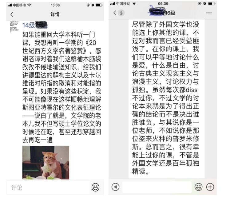 “上谭老师的课特别轻松。他贴近学生,平易近人,善于激发思考,不设藩篱,给了我们展示自己的讲台.”