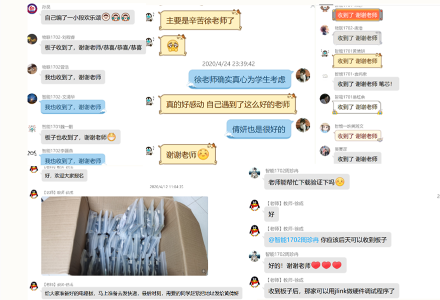 在线教学持续进行,课程实验需要的第二块实验板“STM32开发板”又寄送到了学生手中。有了实验板,学生就有了动力,动手实践没有耽误、实验质量没有降低,徐成老师这才放心了。课程群里不断传来滴滴哒哒的消息提示:“老师,我收到了”“我也收到了,谢谢”“辛苦徐老师了”……