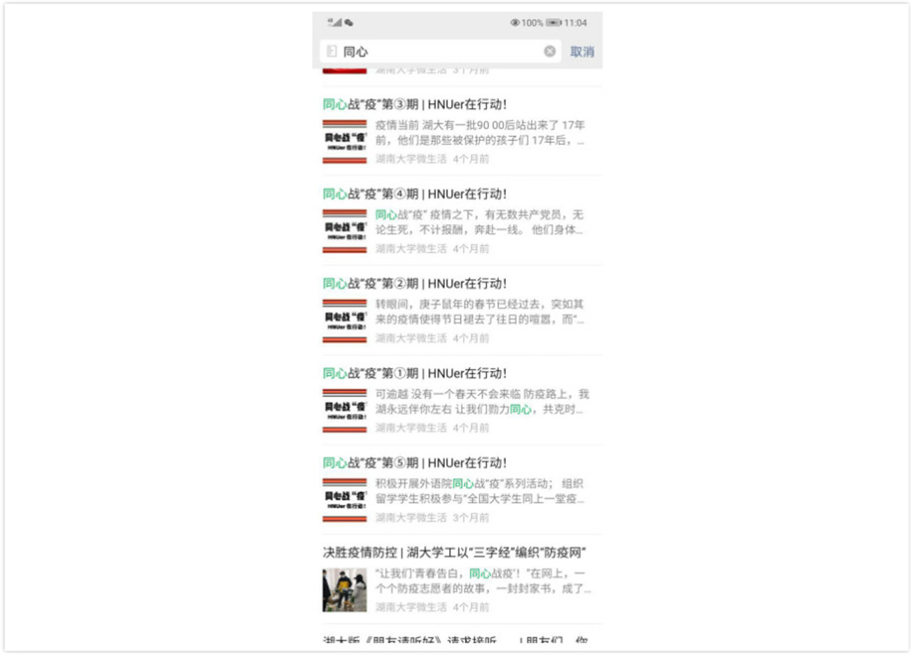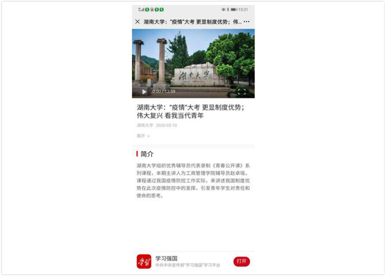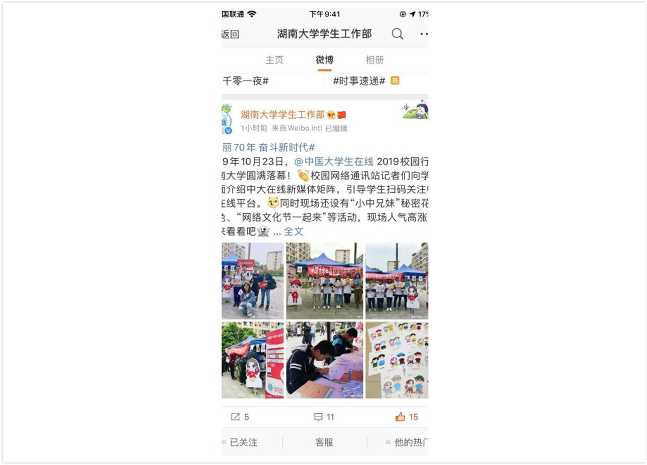 与此同时,在疫情爆发的第一时间,李洪玉老师就带领团队策划了“青春告白、同心战‘疫’”系列主题活动,指导学生通过视频、音频、图、文等形式展示湖大学子在疫情期间的责任担当。活动前后共收集一千多件作品,线上分8期进行展示。