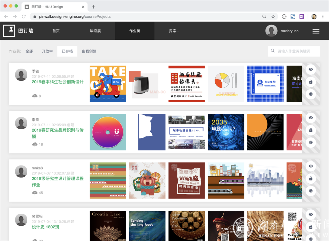 从2014年开始,设计艺术学院的“图钉墙”收录了各类专业课程作业近2万件,不仅涵盖历年的毕业设计作品,也包括了530多个专业课堂或实践教学环节中产出的学生设计文档、调研报告、视频演示、交互原型等。大量的课程样本数据,就这样通过“图钉墙”成为了一种全新的数字化教学评估与资源平台。