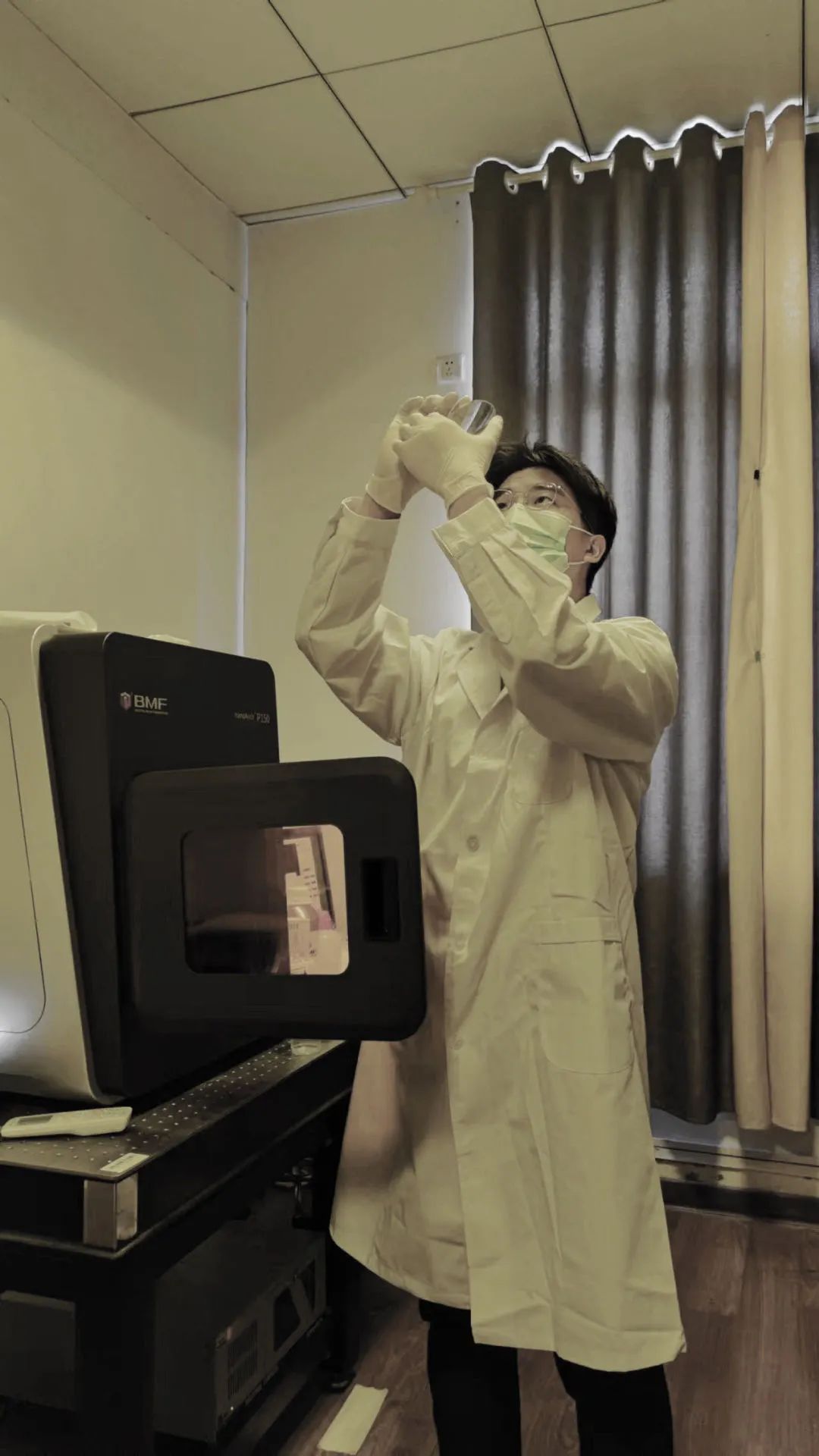 为了将学术科研真正落到实处,徐万青积极寻找机遇。大一时,他了解到国际上青少年群体的近视率逐年飞升,但由于近视防控镜片生产方式的单一化,无法低成本实现镜片个性化定制的功能。基于这一发现,他尝试着有针对性地研发曲面3D打印装备,也由此埋下了投身创业实践的种子。