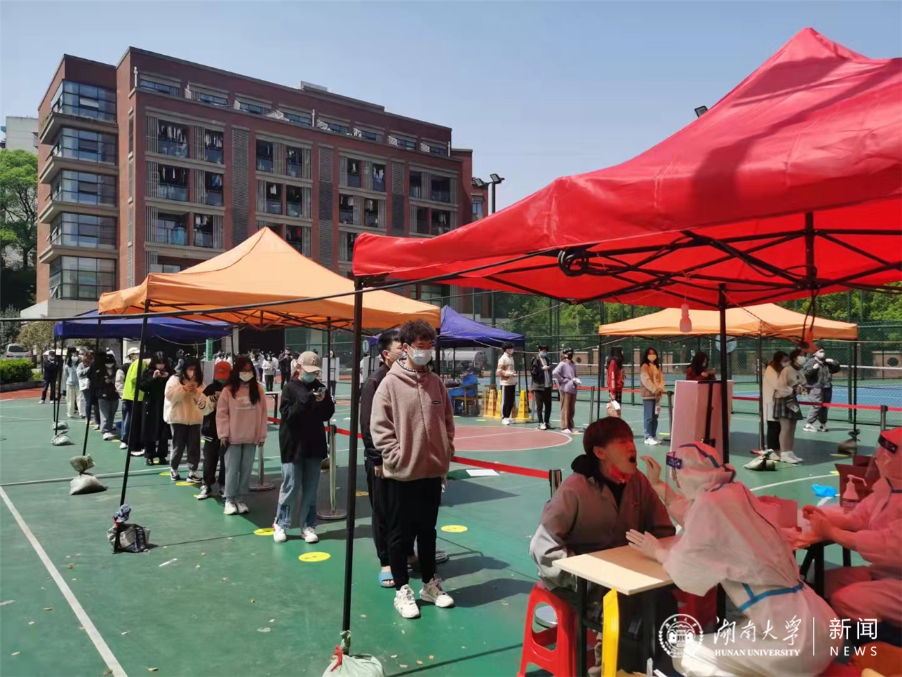 3月28日上午,记者前往南校区体育场,进行第五次核酸检测。学校在南校区、财院校区、天马学生公寓、德智学生公寓、望麓桥学生公寓等地均设置了采样点,并进行错峰安排,分批次采样,采样速度较快。