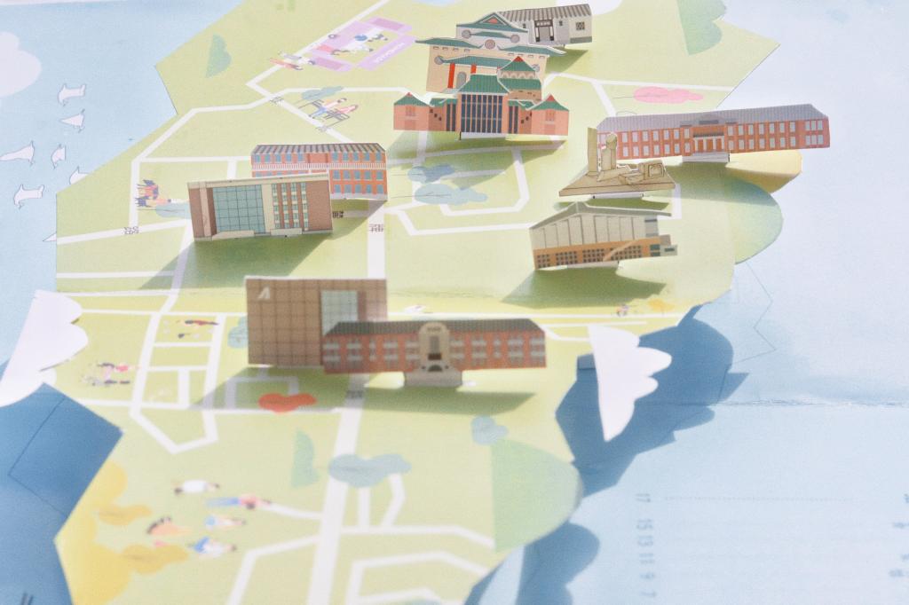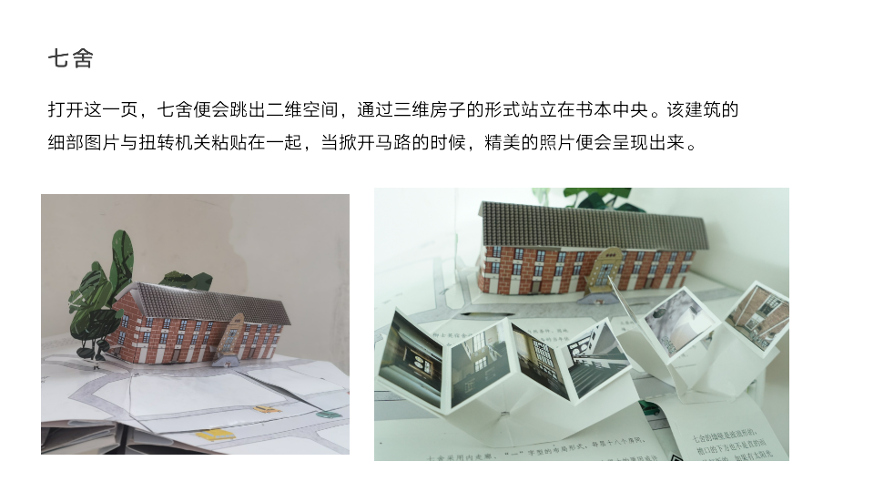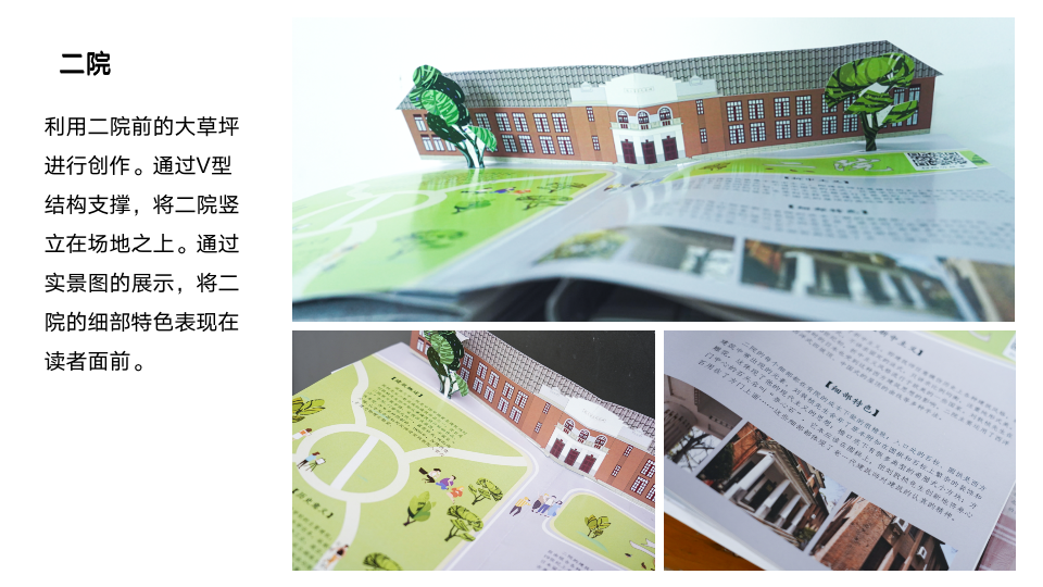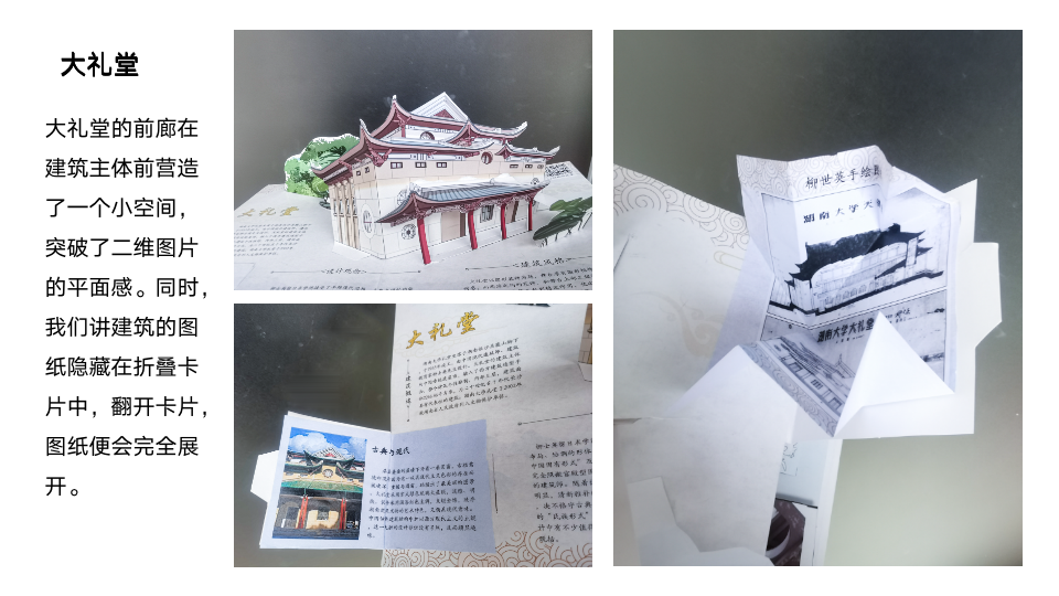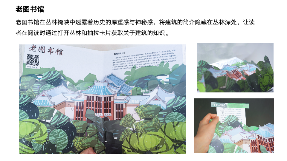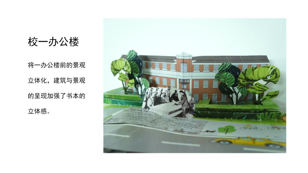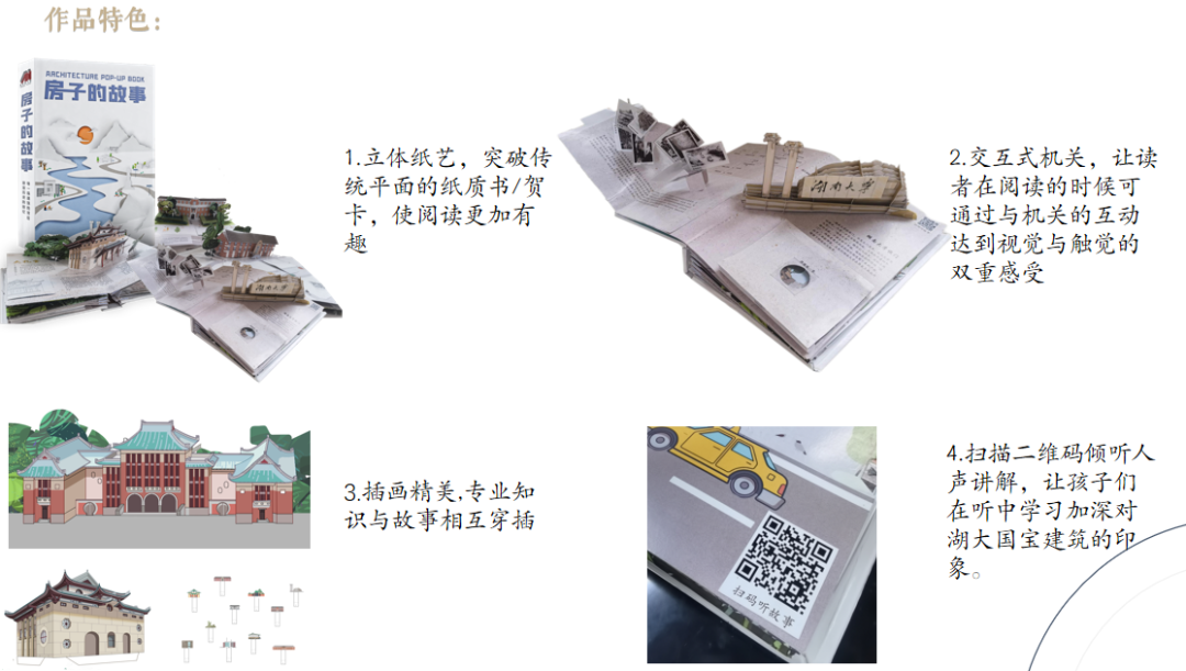 立体书所包含的文化符号表达远比一般图画书形象生动,变化多端的“互动性装置”,是本书的一大亮点。它不仅可以突破二维空间,让建筑活起来,而且可以增强阅读的趣味性与观赏性。将tapplay建筑文化与立体形式相结合,能够实现建筑元素的图画、互动式传播,在给读者带去全新阅读体验的同时,也使得湖大建筑的文化内涵在潜移默化中得到认同。