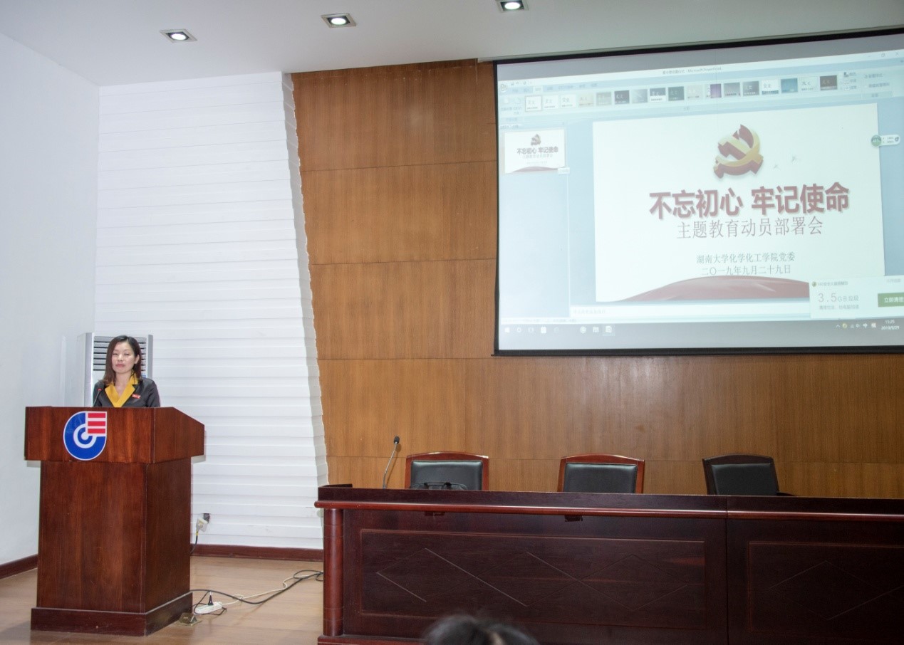 9月29日下午,化学化工学院在新化工楼D区报告厅召开了“不忘初心、牢记使命”主题教育动员部署会,对学院主题教育进行了全面动员和具体部署。学院党委书记王玉枝同志作了动员部署讲话,学校主题教育第一督查指导组成员、校团委书记彭嘉芬同志出席会议并讲话,学院院长张晓兵同志主持会议。