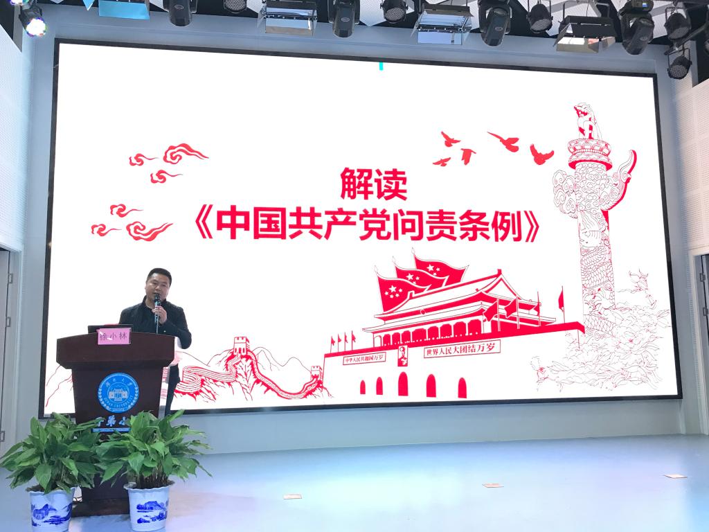 10月31日,普通教育与继续教育党委书记徐小林同志以“解读《中国共产党问责条例》”为主题,在子弟小学多功能厅给普通教育与继续教育党委全体党员上党课。学校主题教育第四督导组组长、研工部部长徐军出席会议。
